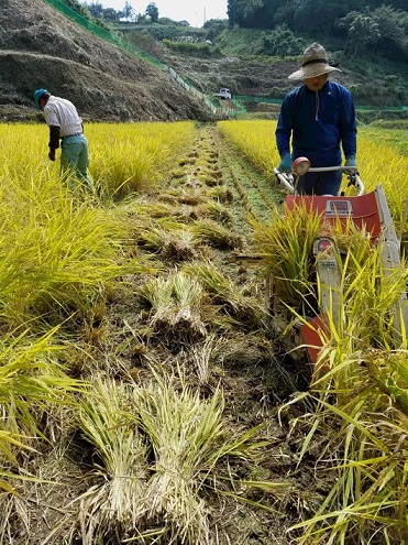 | 2016/10/13 | 【コラボ九州の稲刈り脱穀】春に田植えした藤原さんちの田んぼの稲刈りをしました。天候が悪く遅くなりました。俗に言う八十八日藤原さんにお世話になりました。特に害獣の猪との戦いは大変なものと聞きました。電気柵はもちろんのこと、田んぼに泊まり込みで、花火で脅かしても我が世の田んぼとばかりに走り廻って稲は相当倒れ喰い散らかされました。 ![]() |